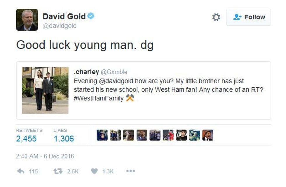But now they’ve faced even more embarrassment on Twitter, or at least their chairman David Gold has. A Hammers fan with the username @Gxmble tweeted Gold, asking if he could retweet a photo of his little brother on his first day at his new school.