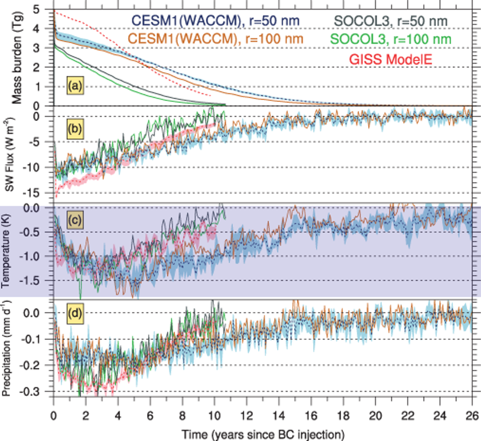 Apart from potentially hundreds of thousands of deaths, five megatons of black carbon are thrust into the atmosphere. Black carbon absorbs heat from the sun before it reaches the earth, while some of it comes back down as rain.