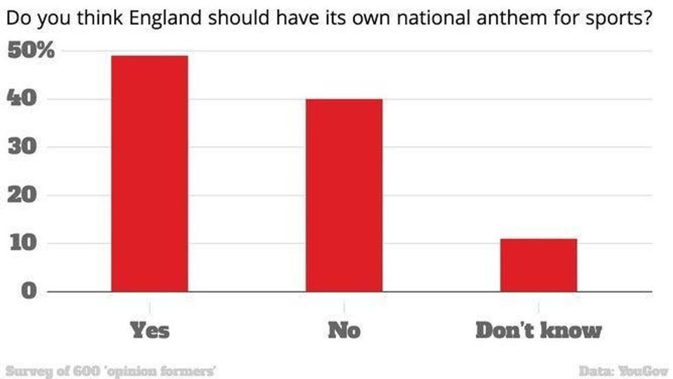 A YouGov survey at the time has showed that 49 per cent of UK “opinion formers” (whoever they are) believe that England should have its own national, even just for sporting events.