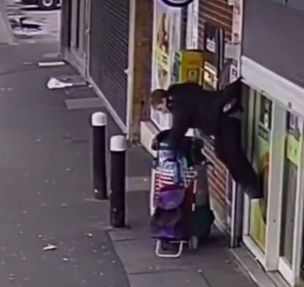 An elderly lady was left dangling upside down after her coat got caught in the security shutters outside a convenience store.