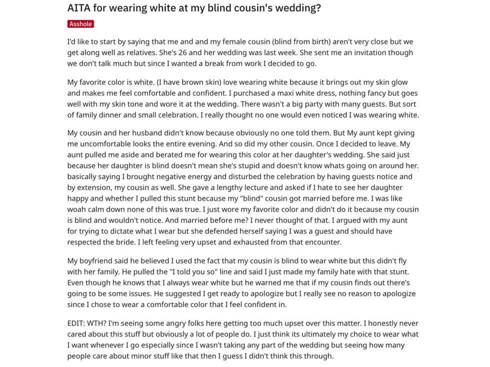 “What does your cousin being blind have to do with it?” one wrote. “You wore a white dress to a wedding. That is like the universal ‘f*** you’ to any bride. And it’s an extra one to a blind bride.”