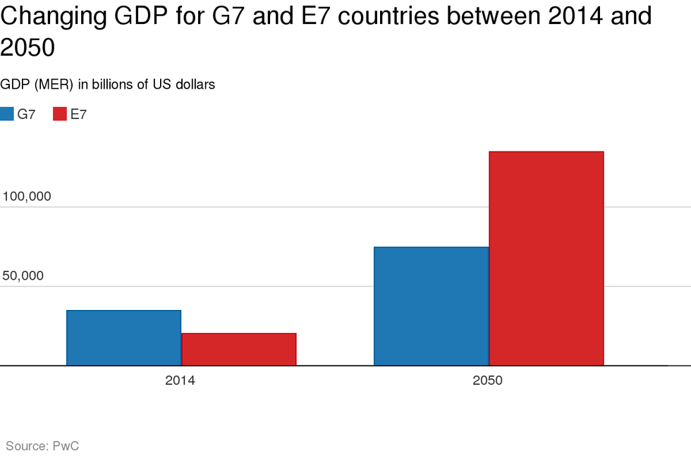 E7 economies, China, India, Brazil, Mexico, Russia, Indonesia and Turkey, will, combined, dwarf the G7 economies, Canada, France, Germany, Italy, Japan, the UK and the US, by 2050.