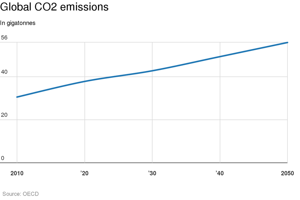 In 2010, the world produced around 33 gigatonnes of CO2 - by 2050 its predicted to be 55.87 gigatonnes which could have truly disastrous effects.