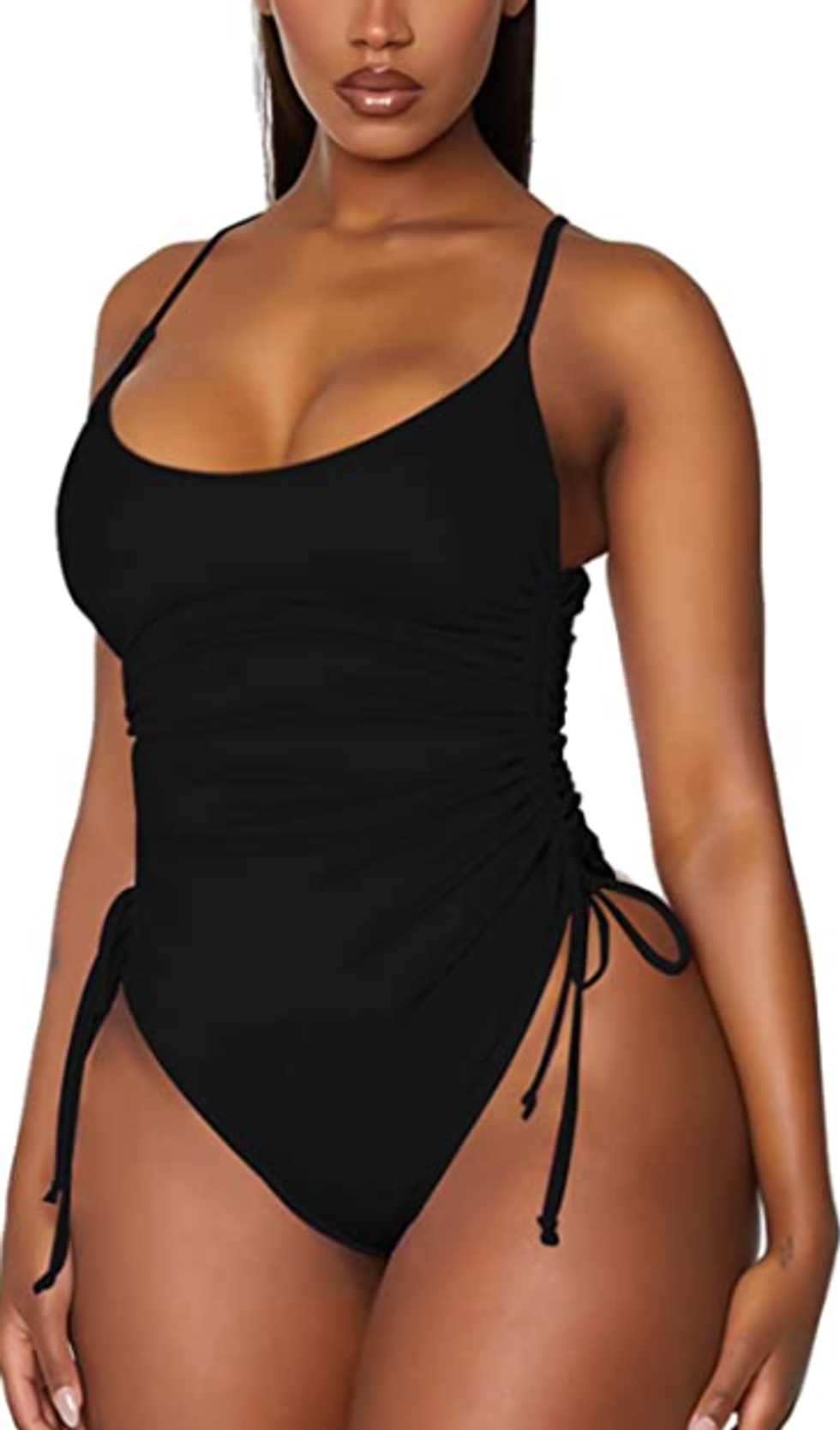 This is one of those bathing suits that flatter a wide variety of body types by either enhancing or creating the illusion of a cinched waist. The black option is our personal favorite and reflects the price we have listed, but other colors and print options abound so click through and check out your favorite in your size to see an accurate price for your preference. Save an extra 10% with the coupon in the description!