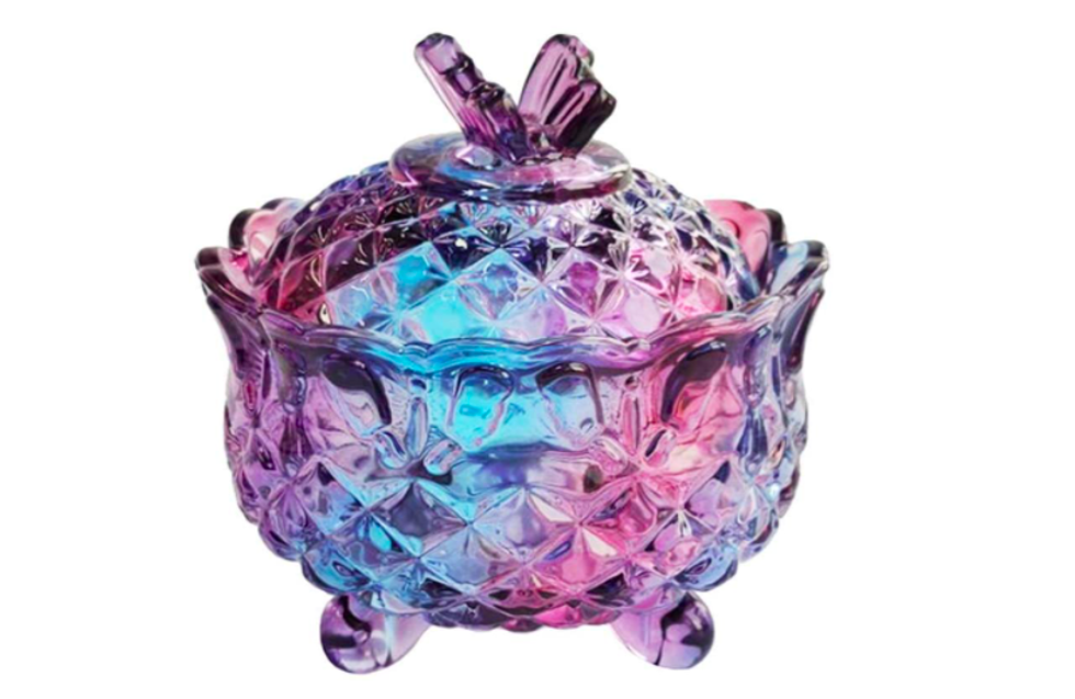 Moms, grandmas, wives, and anyone else who loves a bit of whimsy will love this stunning multi-use footed glass box that can hold anything from sugar to jewelry. The rainbow colors reflect light beautifully, but there are also clear and amber options for those who prefer a more muted color palette in their home.