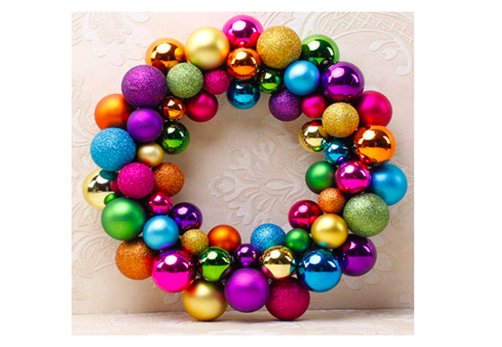 A wreath made entirely of tree ornaments in a vivid color scheme is simply fun and exciting to look at, especially if you’re into unorthodox methods of decorating for the holiday. Blue, purple, and orange Christmas balls are clustered together delightfully in and reflect the ambient light surrounding them, so hang one on your door or wall and let the glow wash over you each evening of the season.