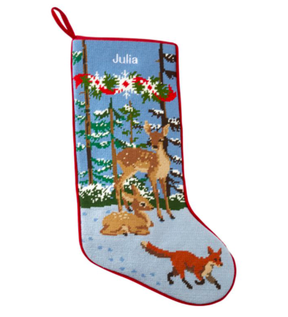 Another customizable needlepoint option is this gorgeous L.L. Bean mantle hanger tht shows a magical woodland scene with deer, a fox, and a stunning evergreen landscape knit from 100% cotton yarns for “especially bold colors and designs,” according to the company.