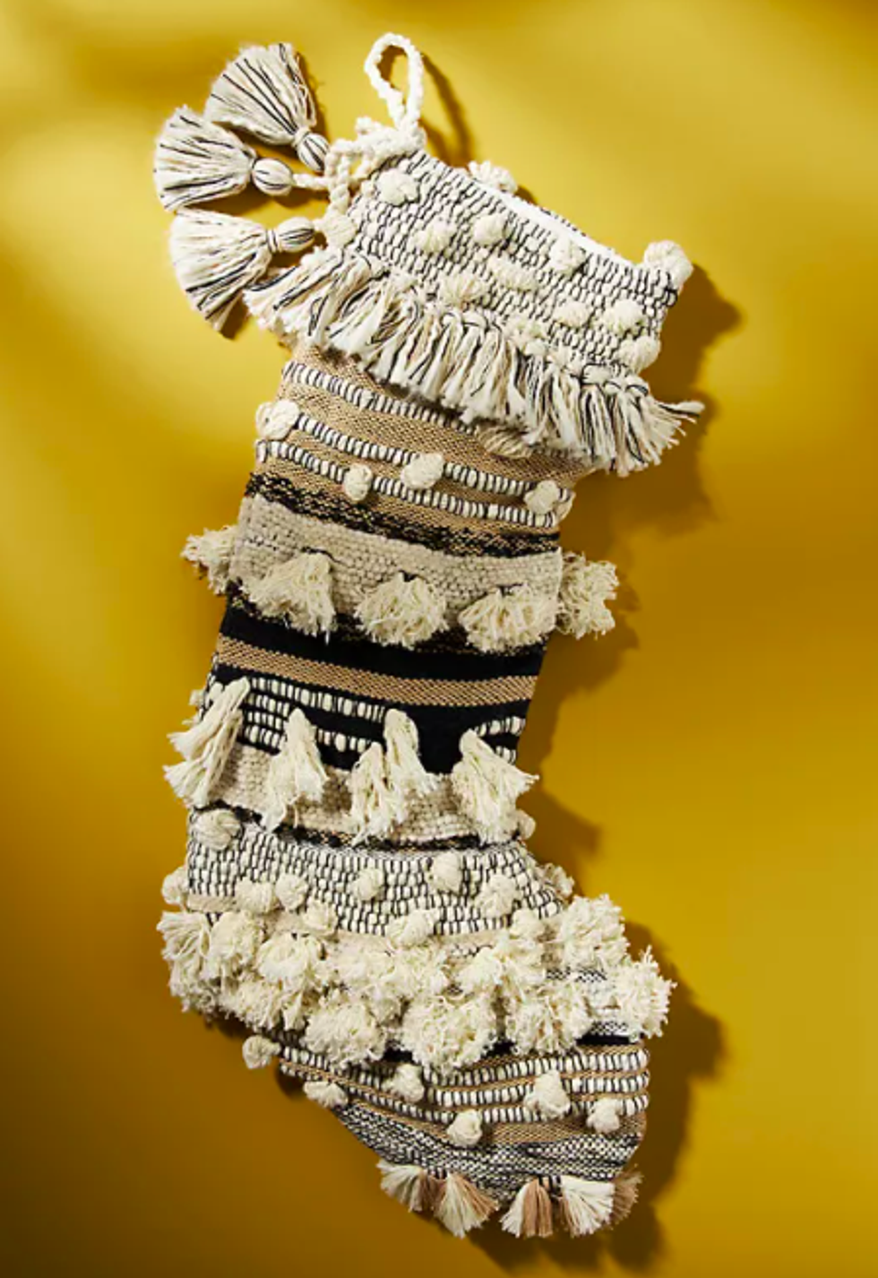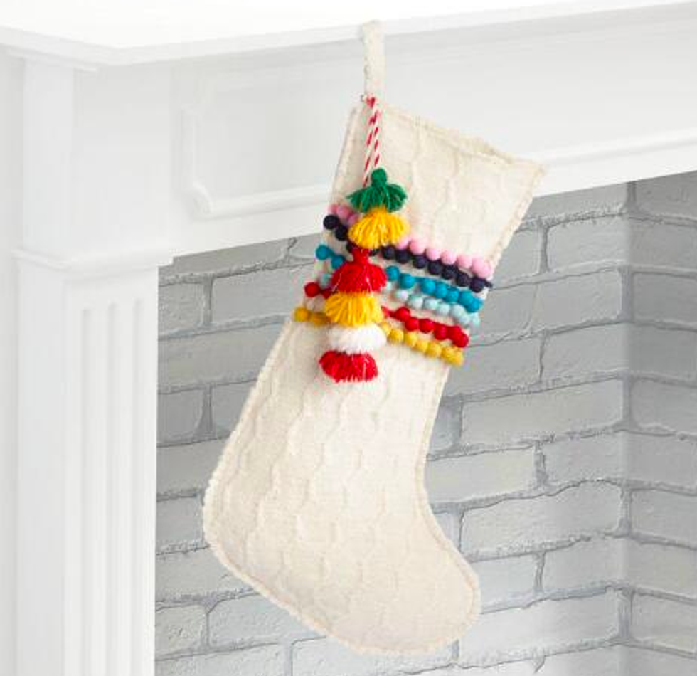 For a modern rustic twist on the stocking, try this trendy pom pom version from World Market. The cream yarn with which it’s knit is stunning in a home with a neutral color palette, but the bright, colorful details make it anything but boring.
