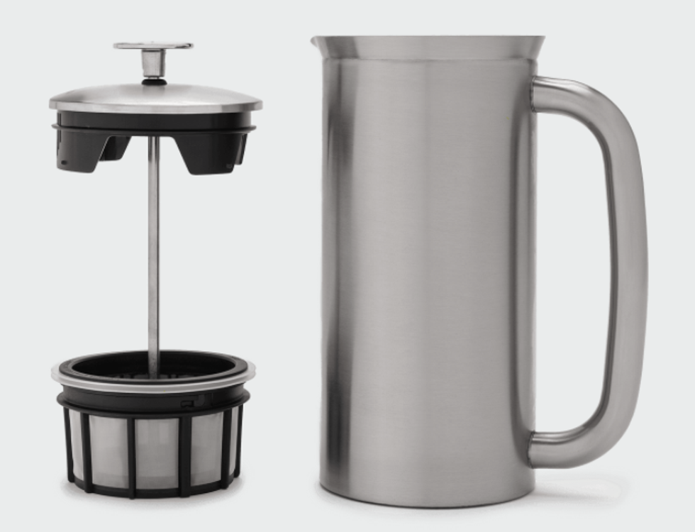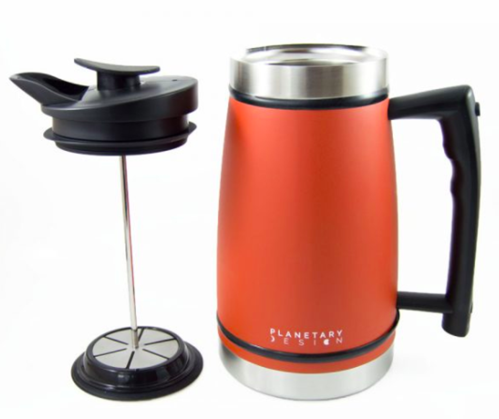 What may look like an ordinary coffee jug is a revolutionary French press design. The patent-pending Brü-Stop plates stop the brewing process by creating a barrier between the brewed coffee and wet grounds after the mesh sieve is pressed down. While testing, our coffee stayed consistent from the first to last cup and remained hot for hours within the double-wall insulated stainless steel. From the kitchen to the campsite, we highly recommend Planetary Design for a consistent cup of coffee