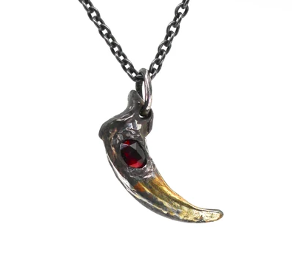 Cast from a real Grey Wolf claw and set with an exquisite rosecut red garnet, this made-to-order piece of jewelry is unlike any other on the planet and will vary slightly from piece to piece in color variation. What does that mean? It’s extremely special.