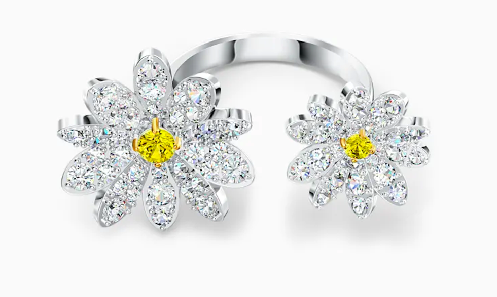 The magic of Swarovski crystals has never shown brighter than with this stunning cocktail ring, open and glimmering with white and yellow stones. This ring is for the fashion-forward and stylishly bold, but its graceful look will wow without looking gaudy. Buy for the person who loves to add a touch of something special to their ensemble every single day.