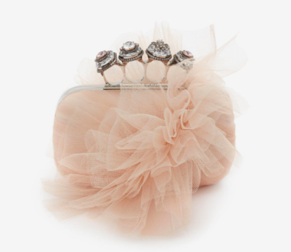A McQueen signature is the sophisticated but tough knuckle duster clutch found season after season sprinkled across the late designer’s eponymous line. This blushing silk clutch utilizes the stanby in the most feminine way possible, pairing it with a cascading flurry of soft, sheer fabric and a rhinestone and pearl spider motif for added eccentricity.