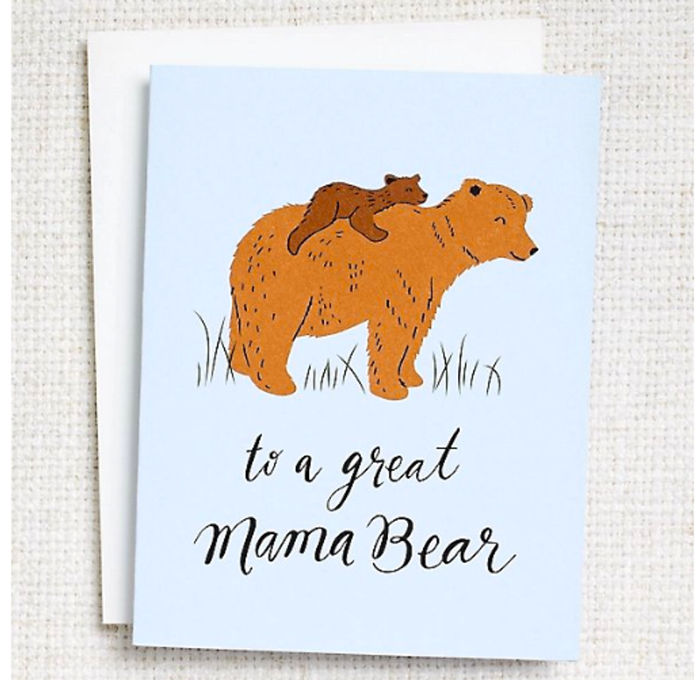 Nothing conveys the warmth and love between mother and child quite as well as this cute, snuggly card featuring a mama bear carrying around her little cub. It’s blank inside, so form your own message of love and appreciation with the space.