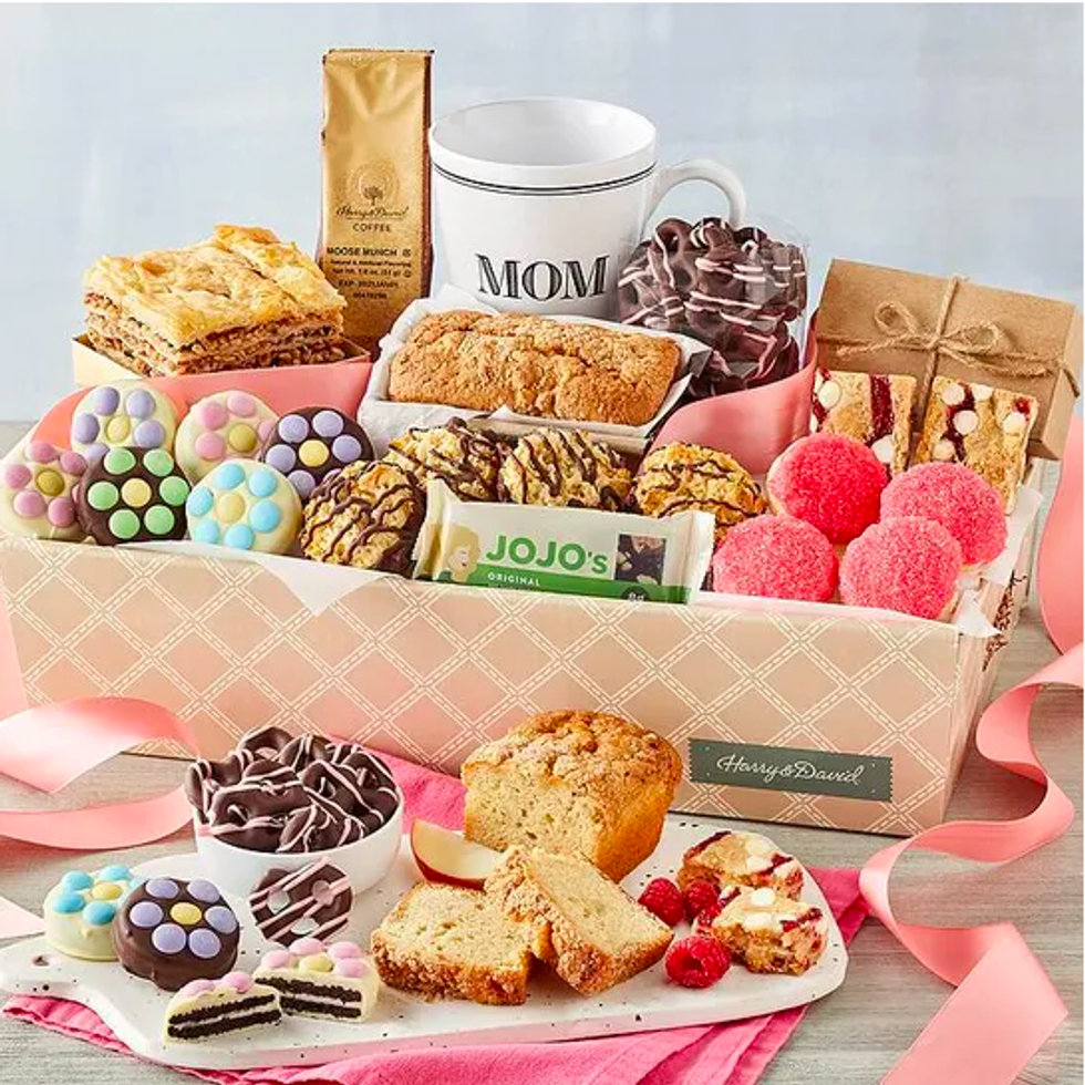 Apple streusel loaf cake, baklava, shortbread, macaroons... the sweets included in this gorgeous basket are almost too many to name! All come nestled in a gorgeous box along with a beautiful “Mom” mug, ready to be delivered to your special mama.