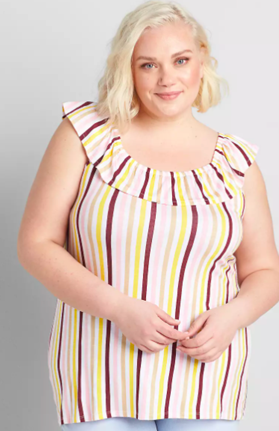 If you’re feeling the girly-girl trend this season but don’t want to come off too sweet, this striped tank has a single row of ruffles to get the job done. We also love the unexpected color combinations on display in the stripes that will transition beautifully from summer to fall.