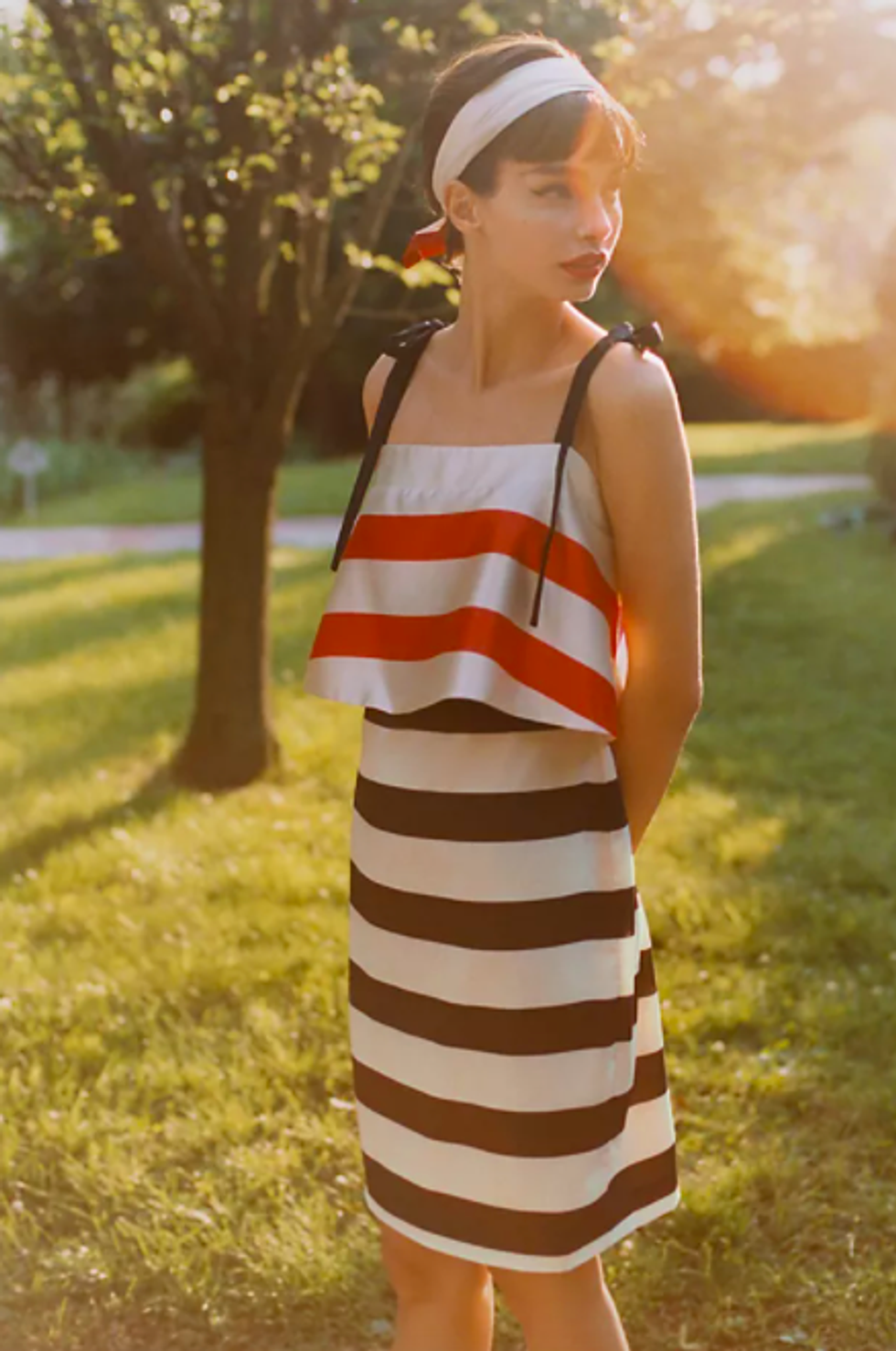 The clean lines and mixed colors evoke classic Americana in the most stunning way possible, proving bold but simple is always a winning ticket. You’ll look like a movie star when you slip into it.