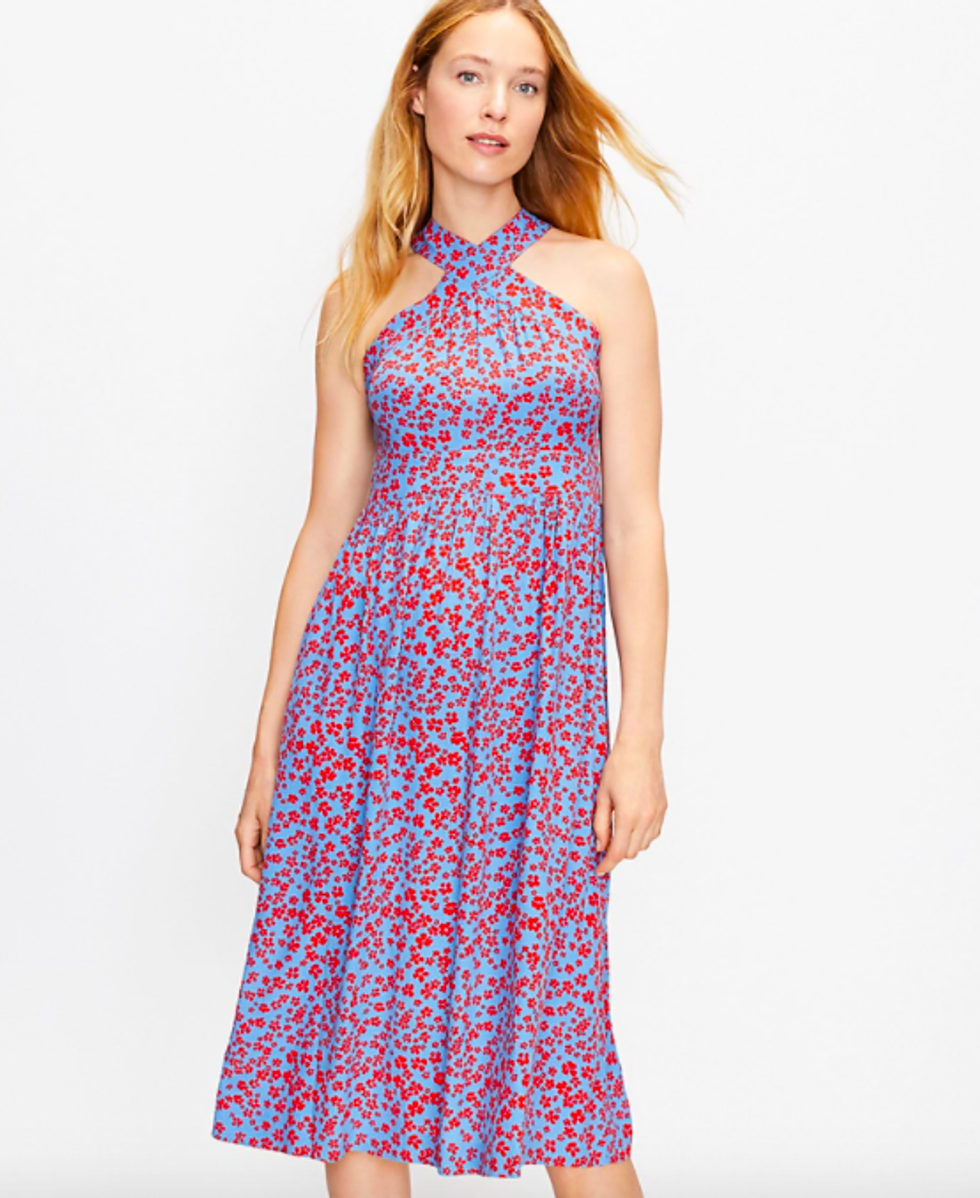 The floral print is gorgeous, but we’re really here for that criss cross neckline that frames the neck and shoulders in equally beautiful measure.