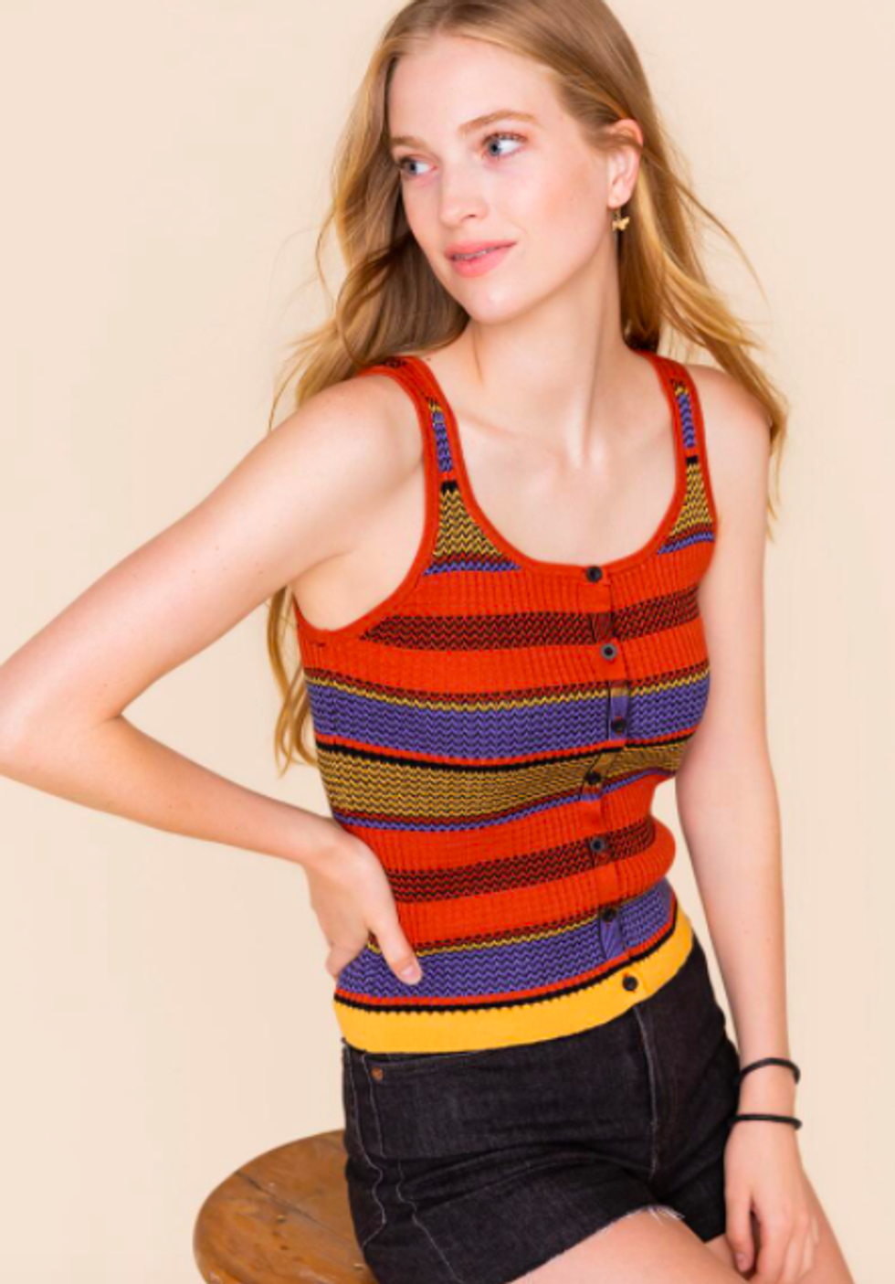 Knits and 70s-inspired prints and stripes are everywhere this season (see above for the luxe version), so why not pick up an inexpensive sleeveless option that lets you experiment with the trend without a hefty investment? We love the bright, happy color scheme of this piece.
