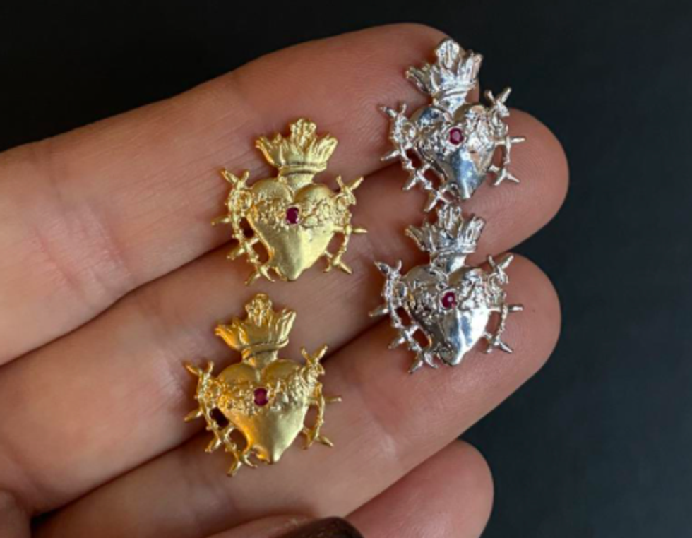 The selection at Sacred Barcelona ranges from mystical talismans to antique mourning necklaces to gorgeous medallions bearing the likeness of Mother Mary, and we can’t get enough of it all. Completely stunning pieces have a rustic-lived in vibe with just a heavy dose of gothic drama, and most pieces are priced well below $500, which is a deal for the quality you get. Just check out the incredible Flaming Heart Earrings pictured below to see what type of beauties you’ll find.