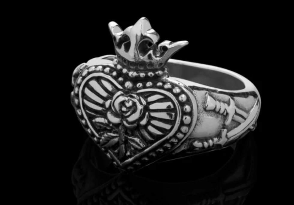 Made for "heavy metal hearts," Etah Love creates striking silver pieces that combine roses, thorns, skeletons, moons, planchettes, and other arcane images into bold statement pieces that toughen up any look with a hint of mystical edge. They recently paired with popular YouTuber Bailey Sarian for a sold-out pair of all-seeing eye pieces that are still worth a look (and hopefully might come back!), but our current in-stock favorite is the Royal Treatment ring that contains a sculpted rose centered in a claddagh-inspired centerpiece.