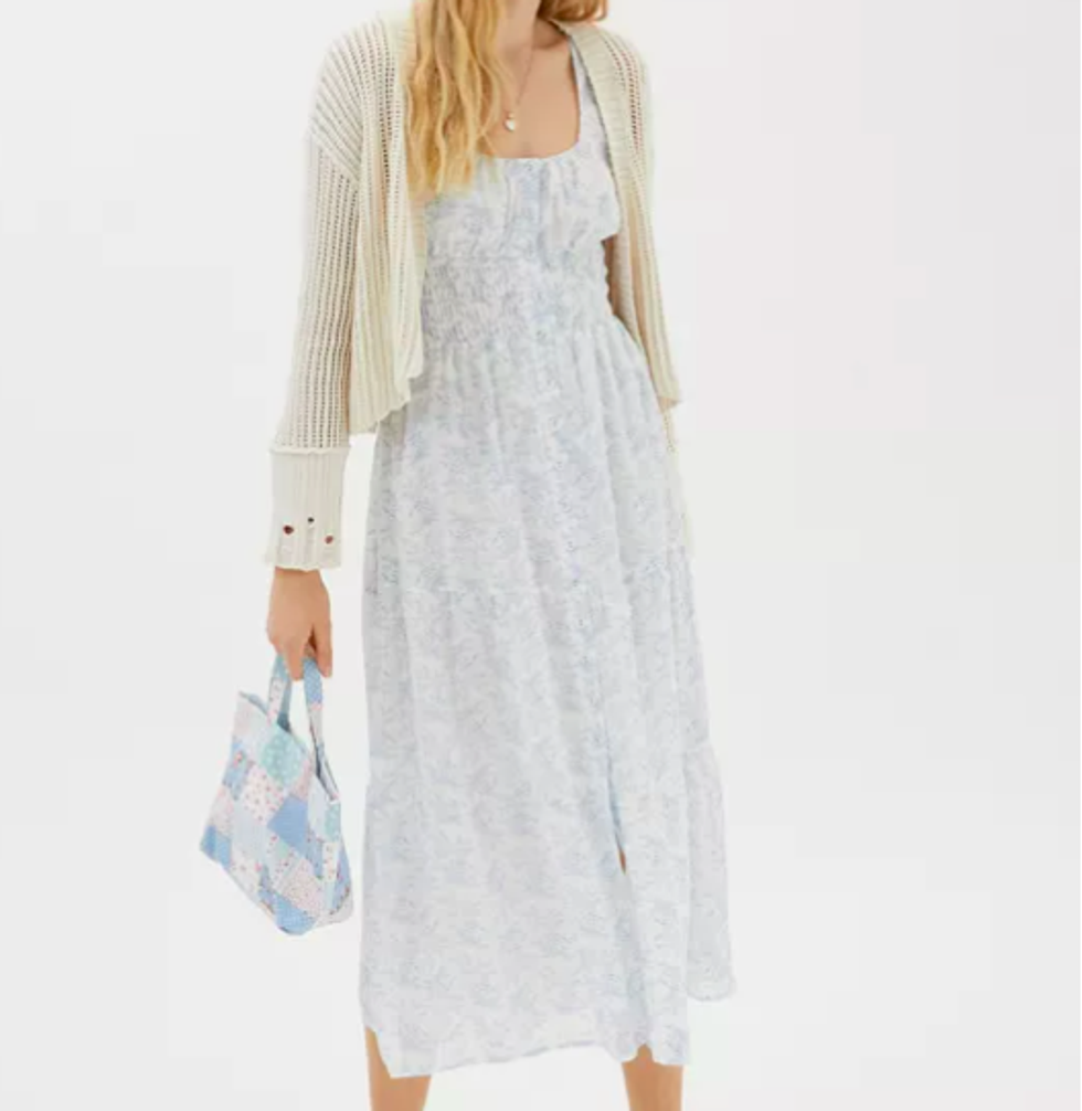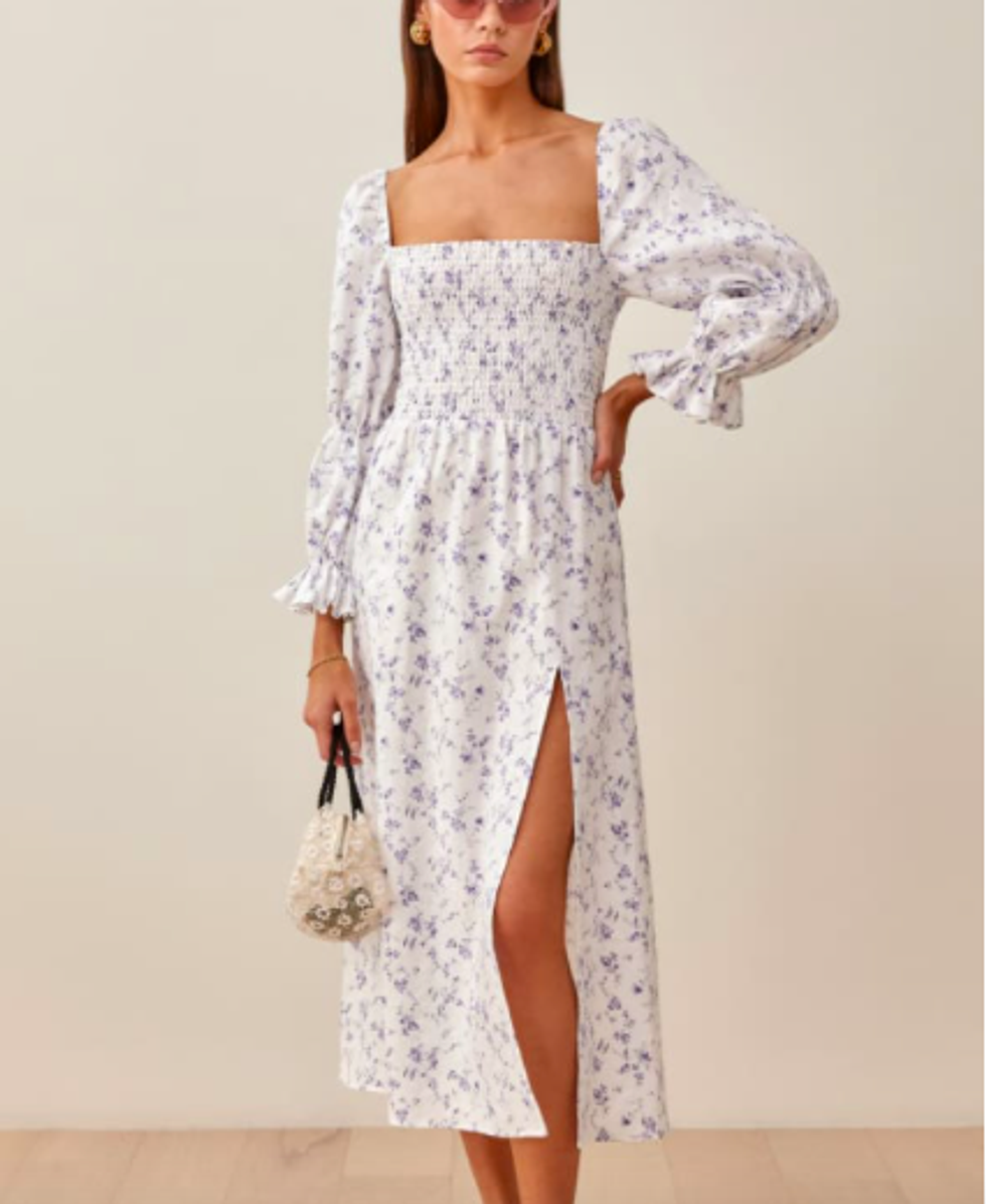 Delicate floral print on linen is an obvious choice for hanging out under the sun, so Reformation added sleeves and a fitted bodice so you can live out your cottagecore fantasy. Add chic geometric shades and a woven handbag for modern flair.