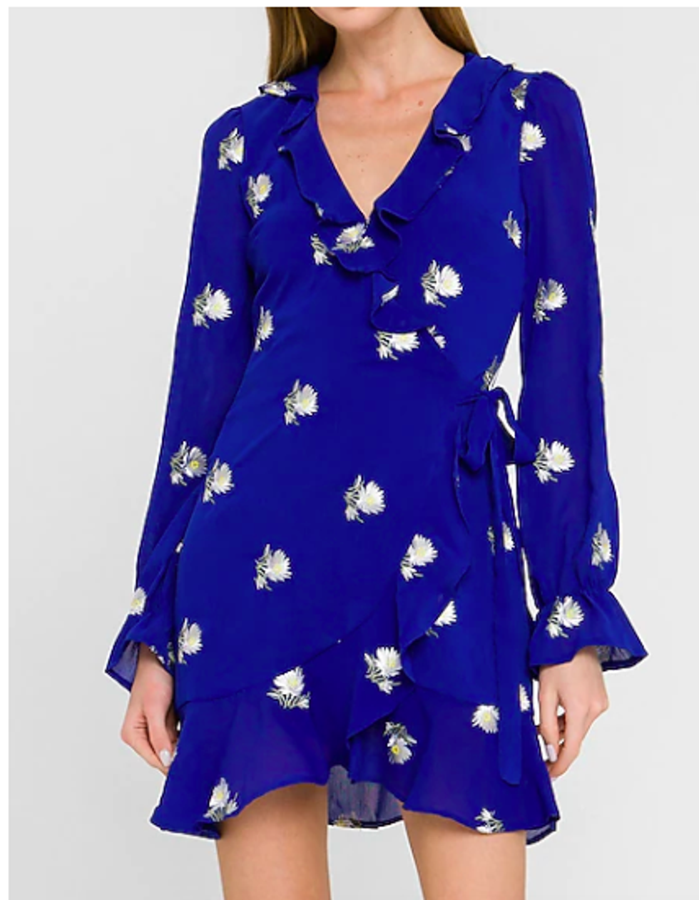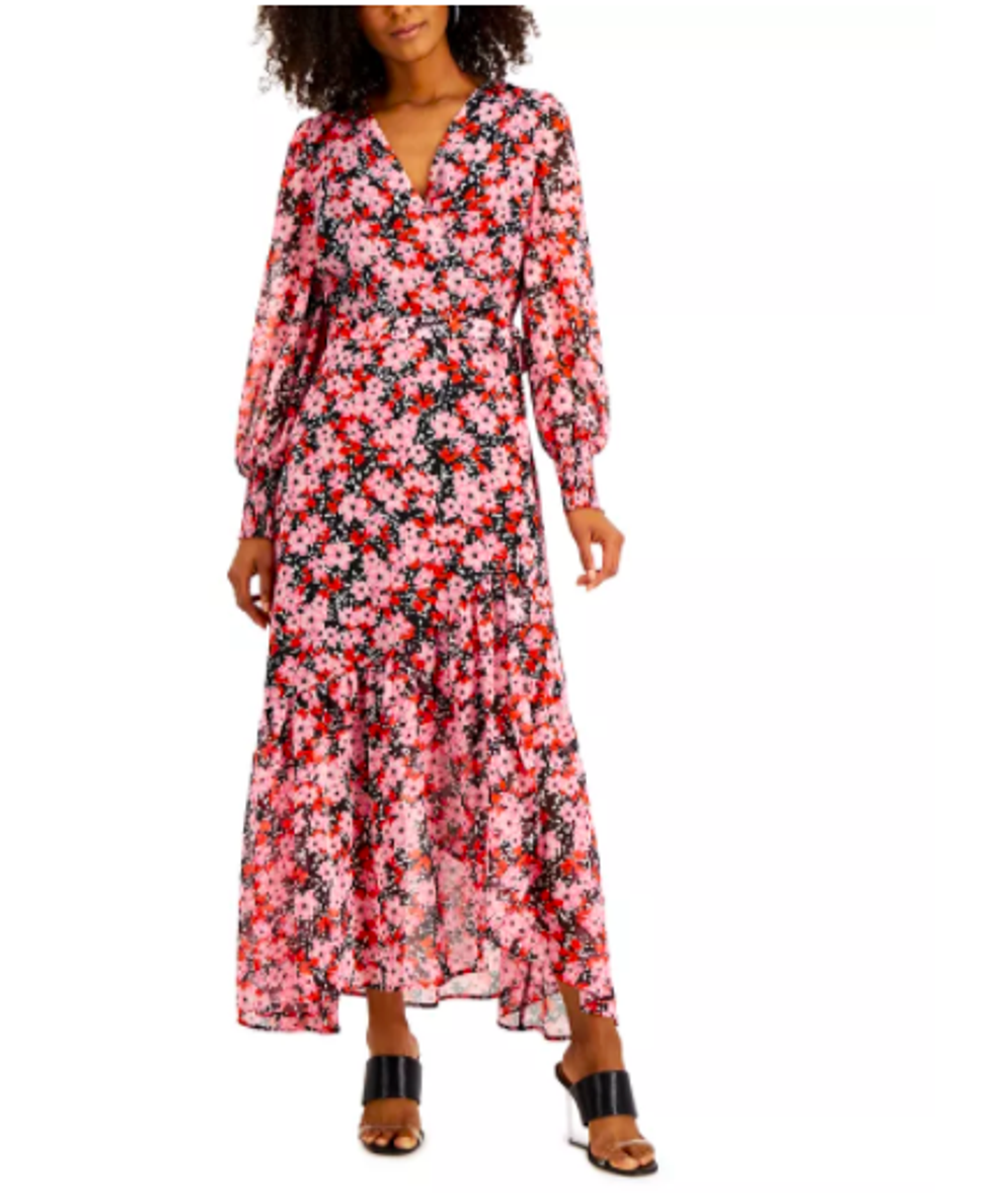 This dress falls all the way to the floor, dripping with dramatic blooms in vibrant, eye-catching colors, and the wrap style is one that truly never goes out of style.