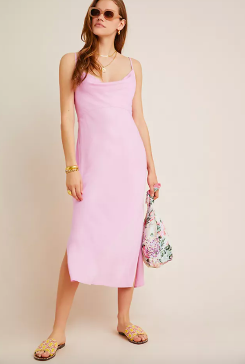 Satiny slip dresses aren’t going anywhere this year, so buy yourself a nice one like this pink dream from Anthropologie and experiment with all the accessory options you have with such a blank canvas piece.