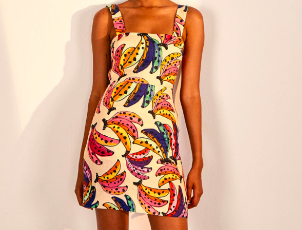 A banana print dress might sound juvenile, but the fruit is rendered in gorgeous, painterly style for a color-soaked mini that’s as carefree as it is attractive.