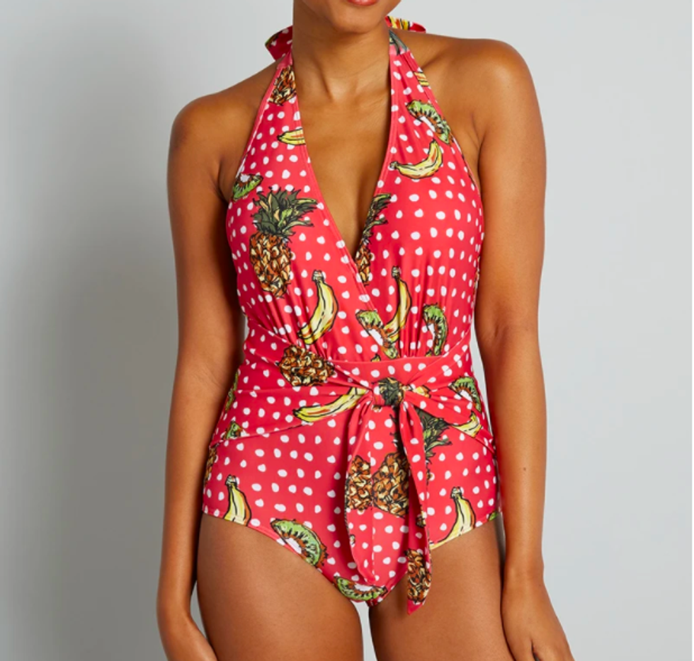 If nineties-does-sixties kitsch is up your alley, you’ll love this bold floral one piece with a revealing double tie in the front that exposes a great amount of skin without leaving you over-exposed.