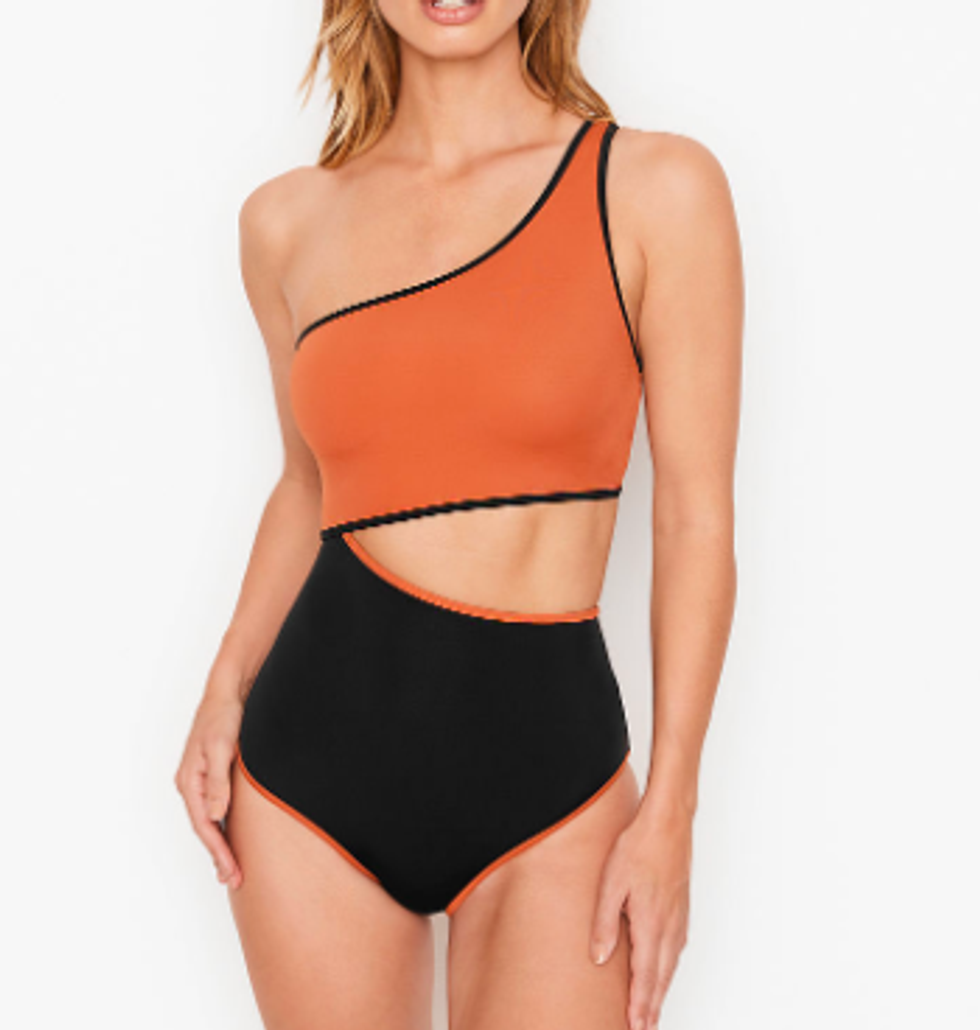 Orange and black are usually reserved for spookier times like Halloween, but this gorgeous ginger glaze and onyx version of the famed combo looks sporty and fun in an off-center cutout shape. A moderate cut reveals just a sliver of sexy backside, and removable padding lets you decide how much oomph you want to add up top.