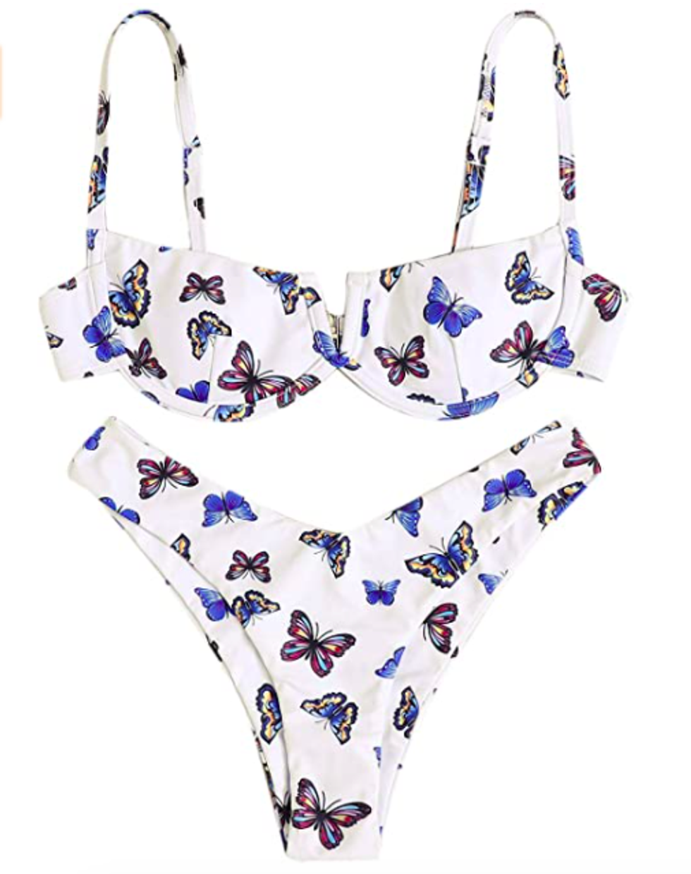 This barely-there bikini is so youthful and flirty with its fun butterfly print and scoop cut bottom. You probably won’t want to hit any high speed water slides in it, but if you want you look adorable on your next summer outing, this is the ticket.
