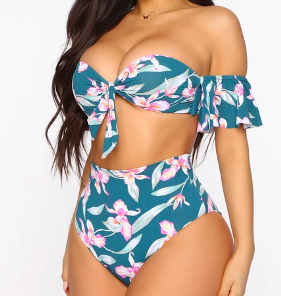 The eternal appeal of tropical florals for summer holds strong in this off-the-shoulder bikini. High waist bottoms make it less revealing than a typical string or high-cut version, and the flouncy shoulders add a touch of retro romance to the overall feel.