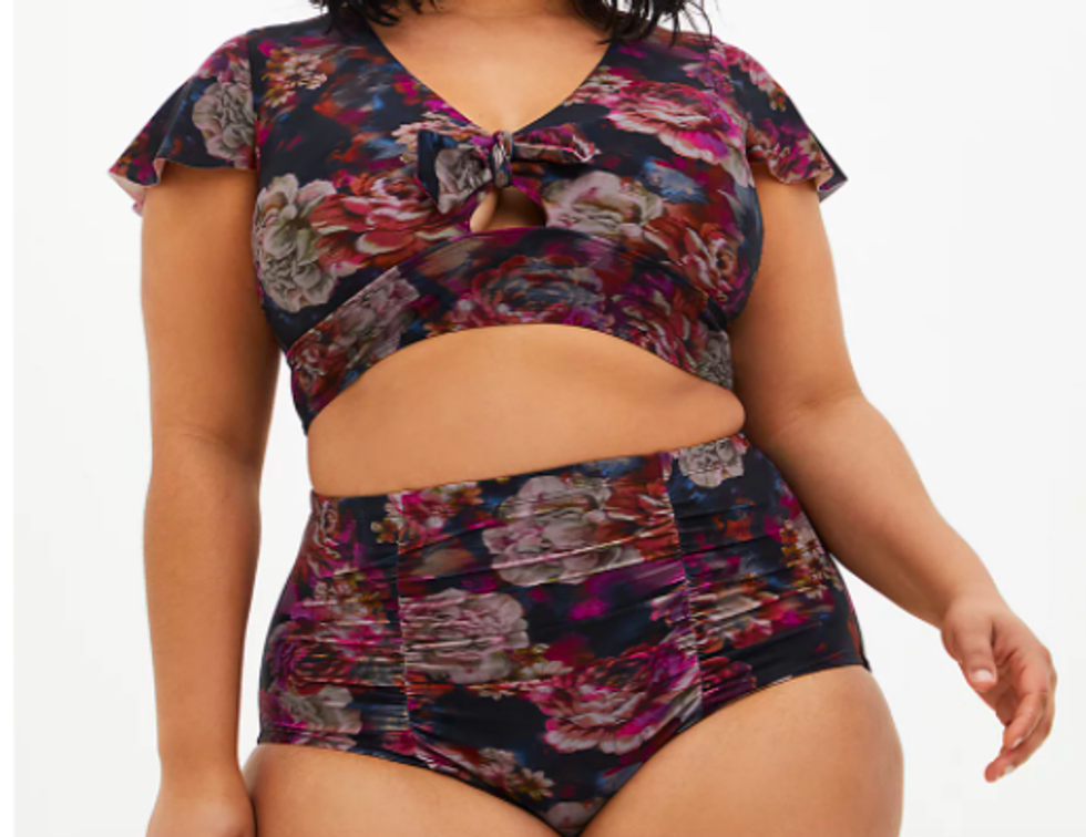 If the cap sleeves above look cute, you’ll also love them done here in a romantic rose print two-piece that shows just enough skin to look sexy without the threat of losing your top in a strong wave. We love the keyhole detail and ruched bottoms (buy them here), too.