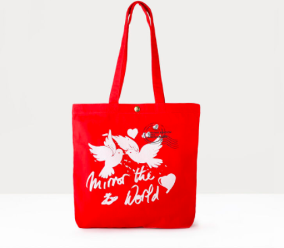 The still-reigning queen of punk fashion continues using her sartorial platform for good with this, the 10th anniversary tote bag celebrating her "Made In Kenya" project that employs local artisans from the country to create gorgeous pieces by folks the company has trained and employed. Featuring a beautiful "Mirror The World" print with kissing doves and a rich, vibrant red color, this tote will dress up and brighten any look you pair with it, plus generous sizing makes it ideal for carting around all your daily necessities.