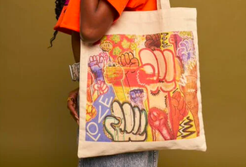 For the first time, Forever 21 collaborated with three artists for Black History Month and the result was a line of beautiful, wearable pieces of art like this Ashley Walker tote bag featuring a series of iconic raised fist logos representing Black Power and the word "love" interwoven throughout.