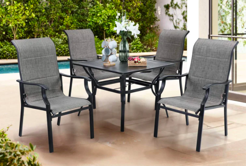 Entertain and dine outdoors in style and comfort with this Steelside patio dining set, complete with table and chairs. The chairs stack for ease of storage and cleanup when not in use and the table is just spacious enough to dine together yet compact enough to be out of the way as needed. Get them all together and save 20% today for a price of just $599.99!