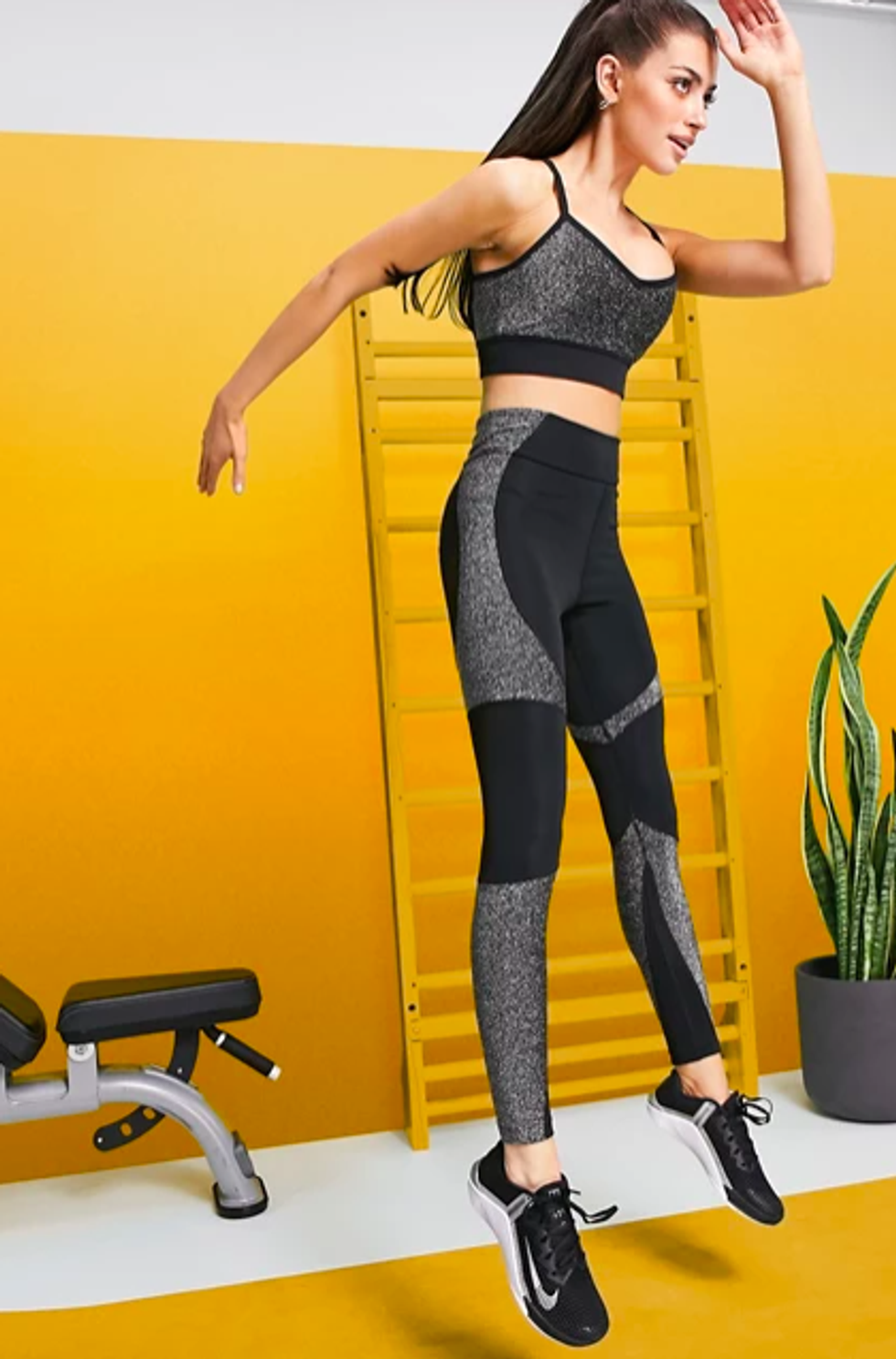 Clever contouring through color works on everything from makeup to clothing to give the illusion of a more chiseled shape, but this glam workout set from ASOS takes it to a whole new level by adding glitter to the equation.