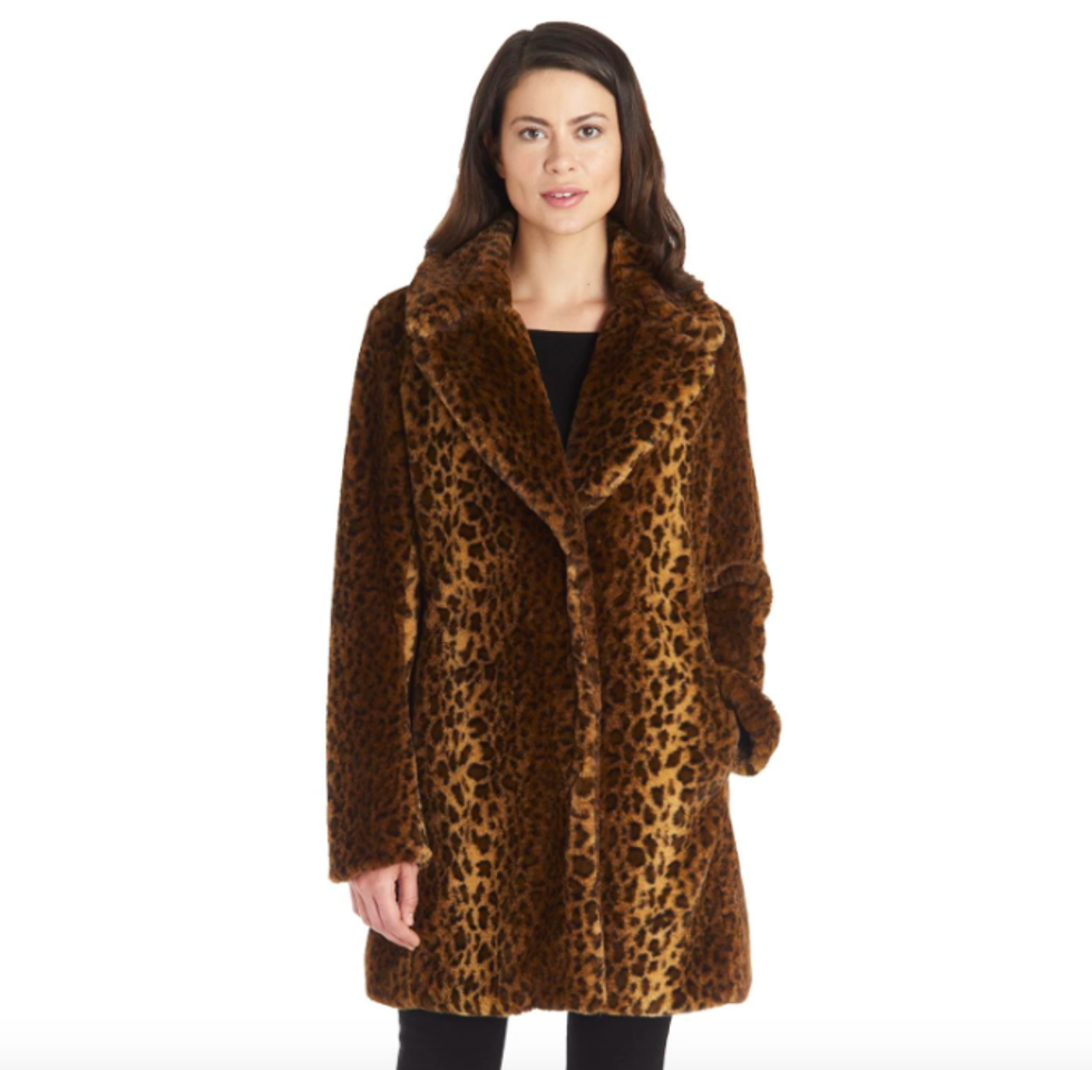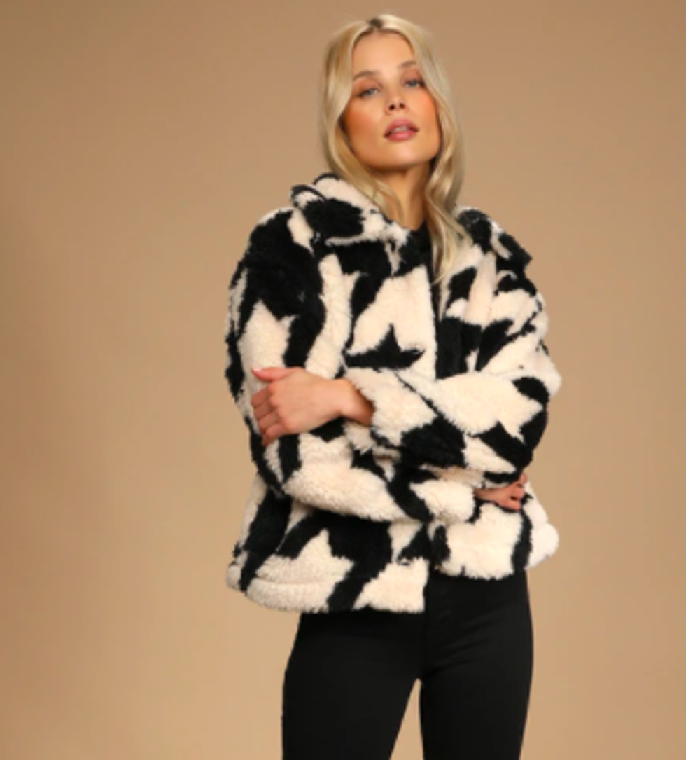 Pretty-girl chic never looked cozier than this faux fur houndstooth stunner from Blank NYC. Pair with black boots and pants to let the jacket shine, or toss over a bright red top and jeans for a colorful take on winter fashion.