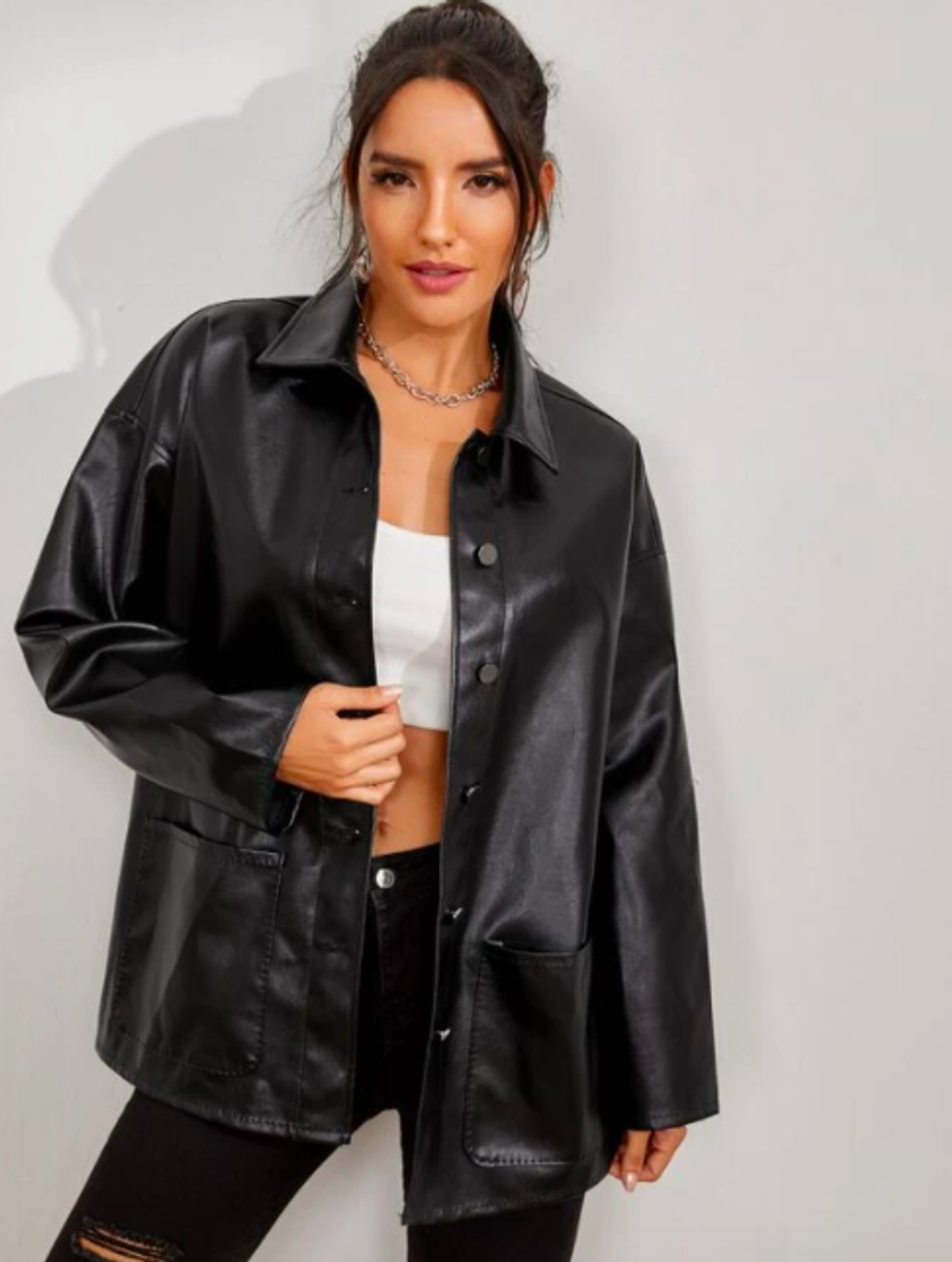 SHEIN Button Front Drop Shoulder PU Leather Coat