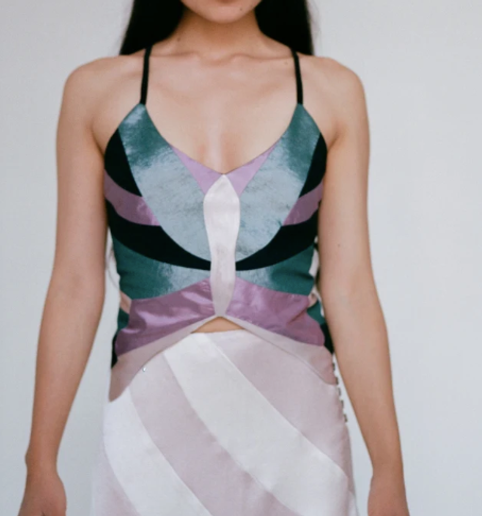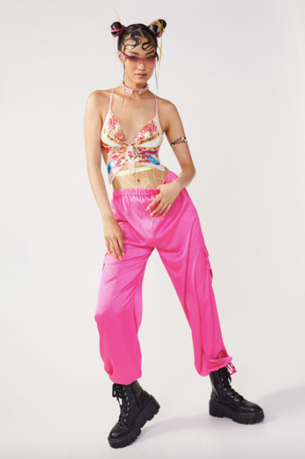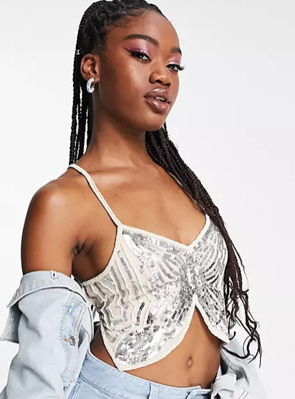 Okay, so $100 for a teeny top is not exactly cheap, but it is the closest you'll find to the original on this list and 95% cheaper than the sold-out AREA version. It also comes in three different color combinations like the pink-dominant option you see here and our personal favorite, the dark purple that shines as iridescent as real butterfly wings against a black sequin backdrop.