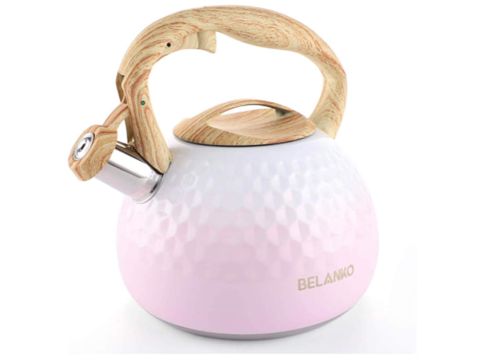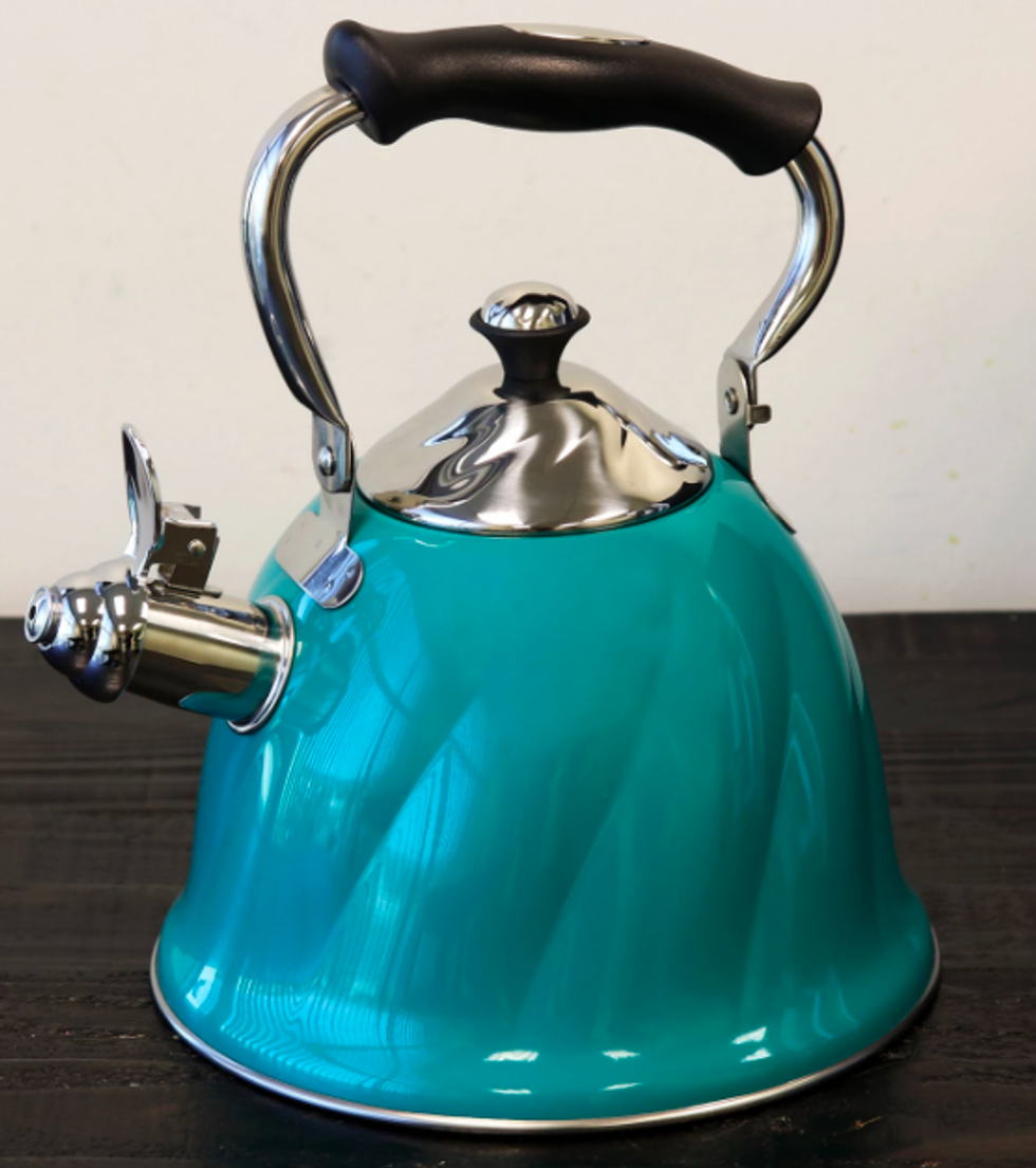 For a soft pastel look with a touch of gorgeous natural wood, try this generously sized 2.7 quart kettle that heats quickly, avoids rust and corrosion, and has a loud whistle to make sure you never forget when the water’s on.