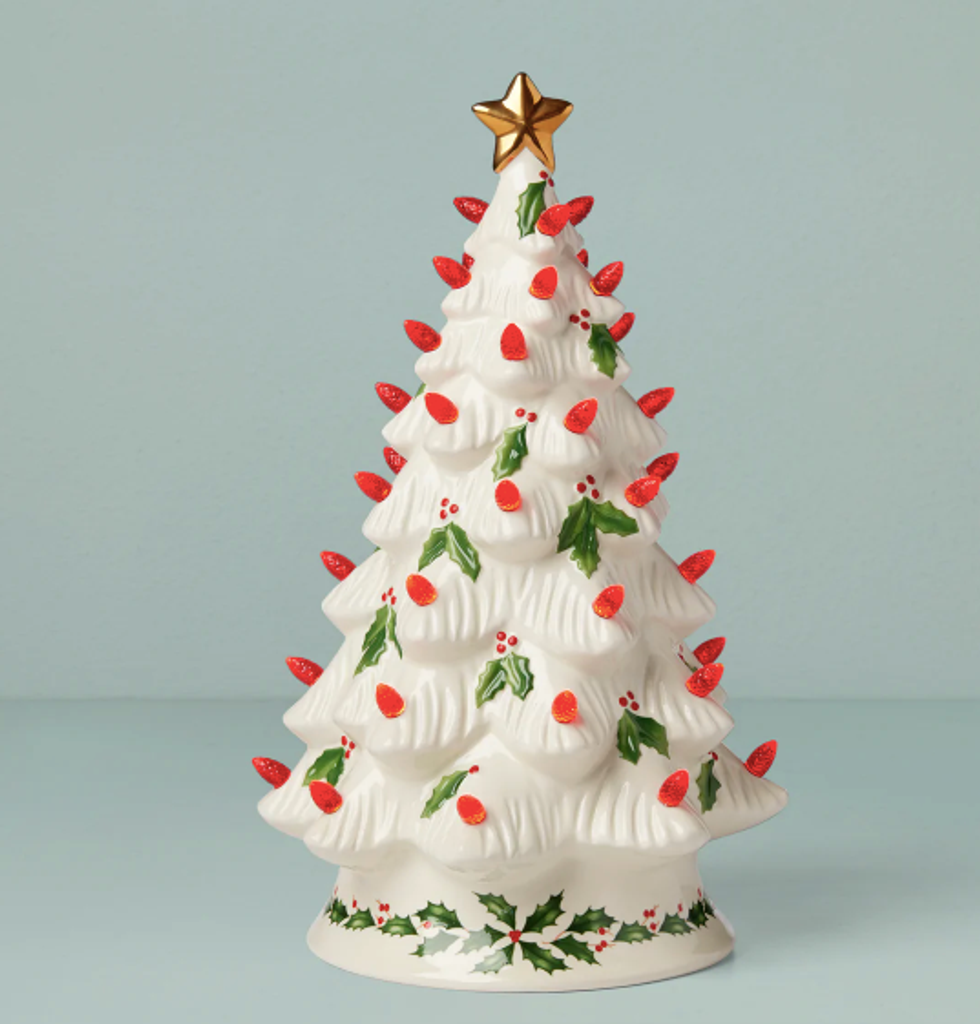 The lit ceramic tree is the perfect centerpiece to any Christmas dinner gathering and when adorned with the signature Lenox holly and berries pattern, it's even more charming and cozy. You'll love the luxe touch of a 24k gold star on top!