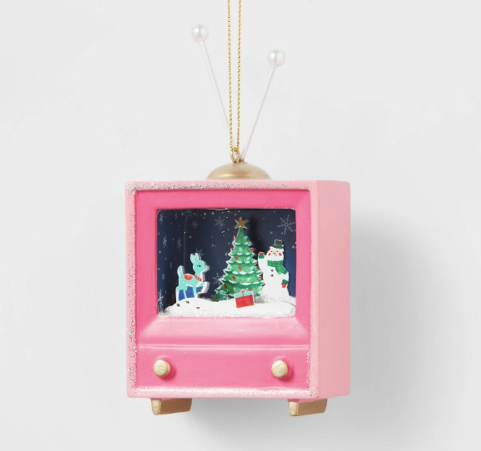 Add a pop of retro kitsch to your tree this year with an adorable snowy pink television scene featuring a teensy blue reindeer and its snowman friend. We think would also look stellar propped up on a mantle or credenza – wherever you like to spread cheer, really! At just $5, you can get a bundle of them for cheap.