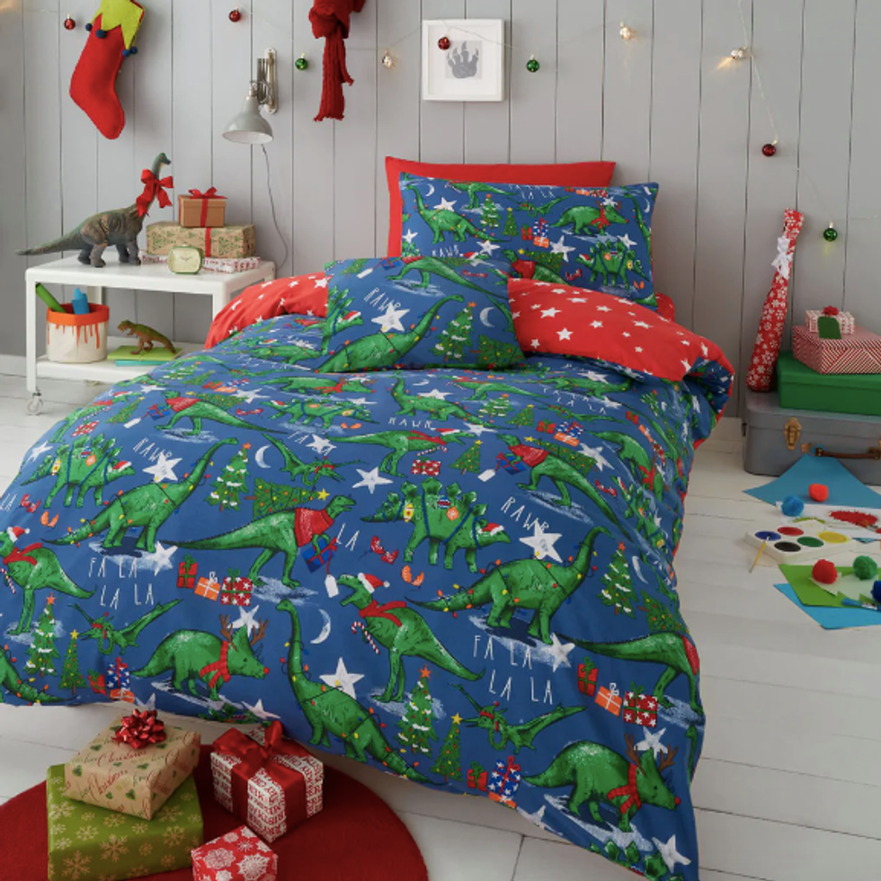 Ensure your children have the best rest possible as they await Santa's arrival on Christmas Eve thanks to this cozy bedding from the Happy Linen Company. The dinosaurs are a fun, non-traditional way to incorporate their interests into Christmas while the hats, scarves, and adorable trees in the background practically shout "Merry Christmas!"