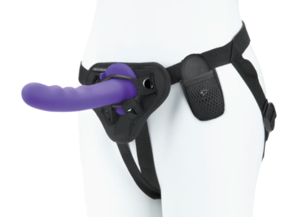 Regardless of your sexual dynamic, this strap-on is likely to be a nice size, shape, and material to please the receiving partner while maintaining comfort and user-friendliness for the wearer. The harness can be adjusted up to 67 inches while the six inch dildo vibrates in 15 patterns and six intensity levels, all operable via remote control.