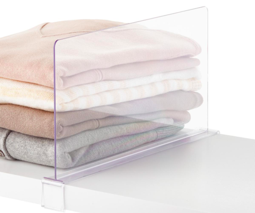 Their clear finish is helping when considering another tip from Karin as well, who says, “Good closet organization means that you can see everything, things are easy to remove and they are easy to put away. Keep seldom-used things on higher shelves and your staples easy to reach.” And with these see-through dividers, even those rare items on higher shelves are easily found when the occasion calls and can be quickly grabbed then placed back in their designated home when you’re finished.