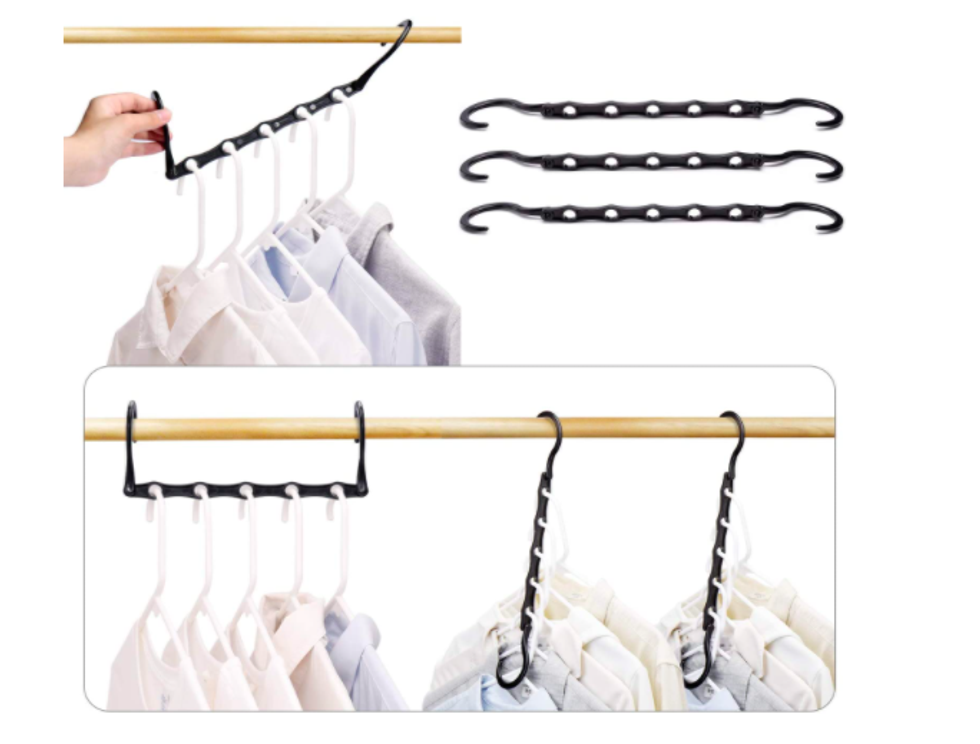 If your wardrobe has outgrown your closet but you're not ready to part with any pieces, these hangers are super handy for going vertical and saving space on you racks. Simply slip the ends of your hangers through the allotted holes, and shirts will dangle at varying heights so as to avoid a traffic jam up top where valuable space is hard to come by.