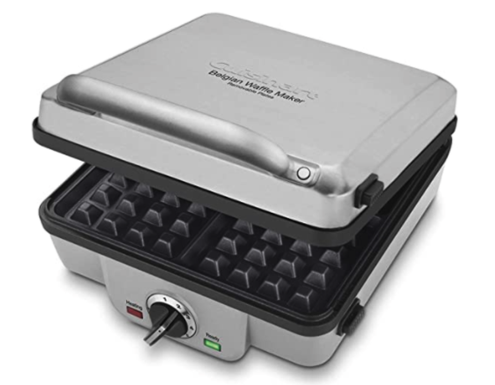 Featuring a whisk and a plate for catching excess batter, the Cuisinart Belgian Waffle Maker is a step up from the mini-makers above in that it creates a larger, one-inch deep waffle and thus feeds more (or more grown-up) people faster.