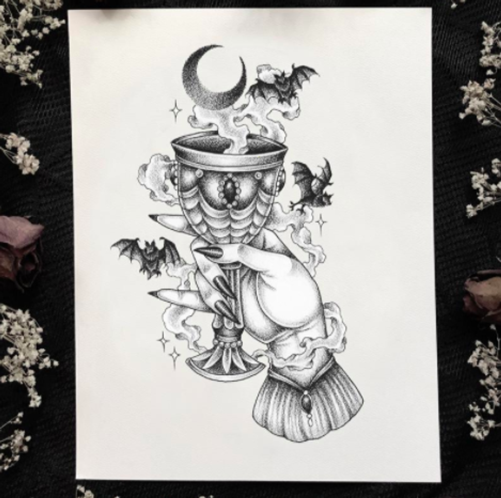 Massachusetts-based artist Dana Glover specializes in gorgeously grim imagery in both her tattoo work (viewable on her Instagram) and visual art pieces (as seen in her Etsy store), and no true wunderkammer is complete with some appropriate artwork to fill out the room and set the mood.