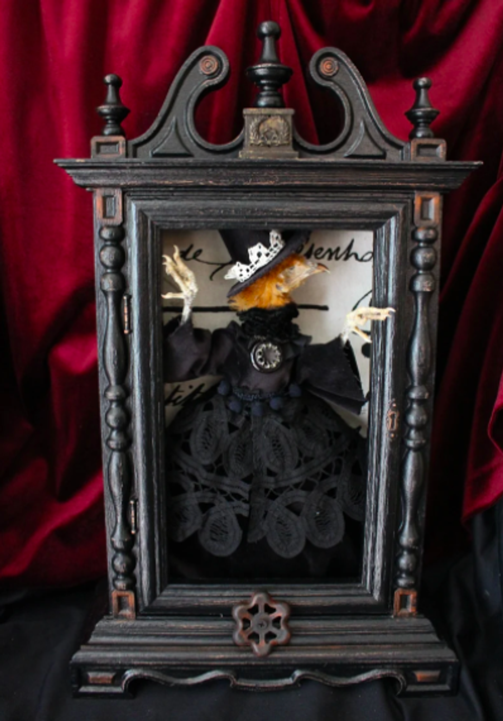 Most often using roadkill or animals that have died other natural causes, Soul Percher’s work subverts the grisly reality of death by infusing an air of surrealist whimsy through crafting elaborate and often dreamlike scenes in which bird queens with rabbit’s claws hold scepters and the skulls of other small rodents. Here we have a cute piece that’s less morbid than many others in the Witchie Poo, an adorable bird posed eternally in her mourning finery.